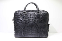 Деловая сумка, сумка для документов, портфель, сумка для ноутбука размера А4 из натуральной кожи крокодила цвет черный. Отдельно необходимо отметить что данная сумка не укомплектована плечевым ремешком. Это ручная сумка, в которой не предусмотрен ни плечевой ремень, ни D-образные кольца для крепления плечевого ремня. Для создания сумок данной модели применена натуральная, фактурная кожа крокодила высокого качества выделки и окраса. Деловая сумка формата А4, сумка прямоугольной формы. Лицевая часть сумки украшена затылочной частью, затылочная часть чуть ниже переходит в спинную фактуру крокодиловой кожи. Обратная часть сумки отшита из крокодиловой кожи со спинной фактурой. Боковые вставки сумки изготовлены из крокодиловой кожи из фактурой хвостовой кожи крокодила, дно сумки выполнено из крокодиловой кожи со спинной фактурой. В верхней части сумки устроены удобные длинные верхние ручки, крепление ручек сумки выполнено с применением металлических хромированных колец, размещенных на лицевой и на обратной сторонах сумки. Верхние ручки сумки изготовлены на основании из натуральной кожи телека и имеют отделку лицевой части крокодиловой кожей. В верхней части сумки вшита П-образная двухсторонняя молния, применение П-образной молнии позволяет более широко открыть сумку и с большим удобством убрать в сумку крупный предмет или достать из сумки крупный предмет. А применение двухсторонней молнии с двумя замками позволяет с удобством пользоваться данной сумкой как правшам, так и левшам и носить сумку в привычной и более удобной для вас руке. Для удобства пользования сумкой внутри сумки устроены удобные карманы для предметов первой необходимости сдвоенный накладной карман и вшивной боковой на молнии. В качестве материала подклада используется натуральная кожа теленка, кожа теленка по цвету подобрана под цвет кожи крокодила.