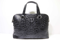 Деловая сумка, сумка для документов, портфель, сумка для ноутбука размера А4 из натуральной кожи крокодила черного цвета. Для пошива сумок данной модели используется натуральная, фактурная кожа крокодила высокого качества выделки и окраса. Деловая сумка формата А4, сумка прямоугольной формы. Лицевая часть сумки украшена затылочной частью, затылочная часть чуть ниже переходит в спинную фактуру крокодиловой кожи. Обратная часть сумки отшита из крокодиловой кожи со спинной фактурой. Боковые вставки сумки изготовлены из крокодиловой кожи с гладкой фактурой, дно сумки выполнено из крокодиловой кожи со спинной фактурой. В верхней части сумки устроены удобные длинные верхние ручки, крепление ручек сумки выполнено с применением металлических хромированных колец, размещенных на лицевой и на обратной сторонах сумки. Верхние ручки сумки изготовлены на основании из натуральной кожи телека и имеют отделку лицевой части крокодиловой кожей. В верхней части сумки вшита П-образная лицевая молния, применение П-образной молнии позволяет более широко открыть сумку и с большим удобством убрать в сумку крупный предмет или достать из сумки крупный предмет. На боковых поверхностях сумки вшиты D-образные кольца для крепления съемного плечевого ремня. Съемный плечевой ремень с регулировкой по длине поставляется в комплекте с сумкой, плечевой ремень выполнен из натуральной кожи теленка без отделки кожей крокодила. Удобным плоским карманом на металлической молнии основной объем сумки разделен на два отделения. Для удобства пользования сумкой внутри сумки устроены удобные карманы для предметов первой необходимости сдвоенный накладной карман и вшивной боковой на молнии. В качестве материала подклада используется натуральная кожа теленка, кожа теленка по цвету подобрана под цвет кожи крокодила.