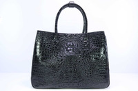 Женская сумка А4 из натуральной фактурной крокодиловой кожи черного цвета. Ширина-37см, высота-30см, толщина-15-16см. Для пошива сумок данной модели используется натуральная фактурная кожа сиамского крокодила, кожа высокого качества выделки и окраса, мягкая, упругая и очень приятная на ощупь. Лицевая часть сумки украшена крокодиловой кожей с крупным, фактурным и симметричным затылком, ниже затылка фактура крокодиловой кожи меняется на спинную. Обратная часть сумки украшена крокодиловой шкурой со спинной фактурой. Боковые вставки выполнены с применением хвостовой части кожи крокодила. Дно сумки устроено с применением крокодиловой кожи со спинно-хвостовой фактурой, верхние ручки сумки отшиты с применением брюшной части кожи крокодила. Сумка трапециевидной формы, с легким сужением к верхней части. В верху сумки устроены удобные высокие ручки из кожи крокодила, высота ручек позволяет с удобством носить данную сумку как в руке, так и на предплечье. Крепление верхних ручек выполнено внакладку на лицевой и обратной поверхностях сумки. Отдельно требуется отметить, что крокодиловая сумка данной модели не укомплектована плечевым ремешком. Конструкция сумки не предусматривает наличия D-образных колей для крепления плечевого ремня. В верхней части сумки вшита металлическая магнитная кнопка фиксирующая доступ в основной объем сумки. Плоский карман на молнии делит внутренний объем сумки на два отделения. Внутри сумки устроены удобные карманы для предметов первой необходимости. На каждой из внутренних поверхностей сумки устроен широкий, почти на всю ширину сумки боковой карман на молнии, по одному с каждой стороны. С одной из сторон устроен сдвоенный накладной широкий плоский карман на всю ширину сумки. На другой стороне накладной объемный карман среднего размера. В качестве материала подклада в сумке используется натуральная кожа теленка. Кожа теленка по цвету подобрана под крокодиловую кожу. На дне крокодиловой сумки устроены четыре металлических хромированных ножки.