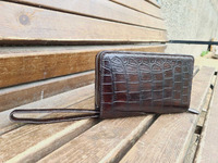 Кошелек из крокодиловой кожи на молнии, увеличенной вместимости, ручное авторское окрашивание легкий патинаж темно-коричневого цвета. Если у Вас появились вопросы по индивидуальному пошиву и или вы хотите заказать любое изделие, напишите нам, и непосредственно сам мастер свяжется с Вами и ответит на все интересующие Вас вопросы. Ширина -20см, высота – 14см, толщина -4см. Вместительный мужской кошелек на одной молнии из натуральной крокодиловой кожи брюшная часть. Кошелек правильной прямоугольной формы с выдвижной ручкой петелькой, выдвижная ручка выполнена из кожи крокодила. Кошелек данной модели был отшит по индивидуальному заказу для клиента, индивидуальный заказ был на пару обуви из крокодиловой кожи и кошелек из кожи крокодила на молнии, кошелек увеличенной вместимости. Кошелек отшит из центральной брюшной части крокодиловой шкуры. В качестве дополнительного украшения выполнен ручной шов по внешнему периметру изделия. По желанию клиента внутреннее наполнение кошелька частично декорировано крокодиловой кожей под цвет изделия. Внутри клатч состоит из двух отделений для банкнот разделенных плоским карманом на молнии, это отделение можно использовать и как отделение для монет и как отделение для иных мелких, но ценных предметов, а также при желании это отделение на молнии можно использовать для хранения документов таких как паспорт, военный билет или автодокументы. Десяти отделений для различных карточек, шесть отделений на одной стороне кошелька и четыре отделения на противоположной стороне кошелька. На каждой стороне крокодилового кошелька, над отделениями для карточек выполнено по удобному плоскому карману, карманы устроенный на всю ширину изделия. В качестве материала подклада применена натуральная кожа козы и натуральная кожа сиамского крокодила. Кошелек оборудован П-образной металлической молнией, применение П-образной молнии позволяет широко и удобно открыть кошелек и с удобством найти и достать из него необходимое вам. Слева и справа от молнии выполнены узкие вставки из крокодиловой кожи, применение вставок из крокодиловой кожи делает кошелек объемным и увеличивает его вместительность. Кошелек данной модели доступен к заказу, возможны любые изменения и дополнения как внутри кошелька, так и снаружи, в любой экзотической коже, практически в любой цвете. Срок пошива подобного крокодилового кошелька 3-4 недели.
