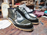 Данная пара обуви была отшита мастером по индивидуальному заказу. При пошиве обуви применялась кожа Shell Cordovan (шел кардован) и кожа крокодила, ручная сборка Handwelted. Пара обуви украшена декоративными вставками из натуральной крокодиловой кожи. На представленных на сайте фото вы видите, как конечный результат, так и промежуточные этапы сам процесс пошива и сборки данной пары обуви.