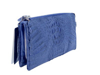 Крокодиловый клатч из натуральной фактурной кожи крокодила темно-синего цвета. Фактурная кожа крокодила кайман применена при пошиве клатчей данной модели. На лицевой части клатча мы видим фактурную затылочную часть крокодиловой кожи, на обратной стороне клатча использована крокодиловая кожа со спинной фактурой молодого крокодила кайман, также на обратной стороне клатча устроена удобная ручка из кожи крокодила. Клатч данной модели довольно интересное изделие. Доступ во внутренние отделения клатча данной модели выполнен как в верхней части клатча, так и в нижней его части, давайте рассмотрим конструкцию данного клатча более детально. В верхней части данного крокодилового клатча вшита металлическая молния, молния вшита с выпуском на сторону, такая технология установки молнии позволяет получить более удобный доступ внутрь изделия, расстегнув которую мы увидим два кармашка в одном из которых устроены слоты для карточек, на противоположной стороне сдвоенный накладной карман. В другом кармане устроены слоты для карточек и широкой плоский карман. Перевернув данный клатч мы видим еще одну металлическую молнию П-образной формы, расстегнув которую нашему взгляду откроется отделение, состоящее из пары карманов, в которых можно хранить документы и мобильный телефон, внутри этих отделений выполнен накладной карман с прозрачным окошком. В качестве материала подклада используется натуральная мягкая и приятная на ощупь кожа теленка. Клатч данной модели является довольно старой моделью и в остатках на фабрике остался только один клатч темно-синего цвета.
