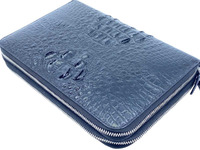 Большой, вместительный, объемный клатч на двух молниях из натуральной фактурный кожи крокодила, спинная часть крокодиловой шкуры цвет черный. Для изготовления крокодиловых клатчей данной моделей фабрика использует натуральную кожу молодых сиамских крокодилов с фактурной спинной часть. Кожа крокодила мягкая, очень приятная на ощупь, высокого качества выделки и окраса. Для пошива клатчей данной модели фабрика использует один цельнокроеный кусок крокодиловой кожи, применение цельного куска кожи повышает статусность изделия. На лицевой стороне клатча расположена крокодиловая кожа с фактурной затылочной частью затем далее крокодиловая фактура меняется на спинную часть, и обратная сторона клатча выполнена из крокодиловой кожи с фактурной спинной фактурой молодого сиамского крокодила. В верхней части клатча вшиты две П-образные металлические молнии, преграждающие доступ внутрь клатча. С одной из сторон устроена удобная выдвижная ручка петелька, ручка изготовлена на основании из кожи теленка и отделана кожей крокодила. Внутри одного из отделений устроено пара широких плоских карманов и четырнадцать отделений для карточек, по центу этого отделения устроен удобный широкий, но плоский карман на молнии. Второе отделение выполнено в одном объеме. В качестве материала подклада данного крокодилового клатча используется натуральная кожа теленка под цвет кожи крокодила и внутри отделения на молнии и внутри других кармашков используется текстиль.