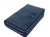Клатч на молнии из спинной части сиамского крокодила черного цвета. Довольно редкая модель крокодилового клатча на молниях для мужчин. При производстве крокодиловых клатчей данной модели фабрика использует натуральную, фактурную спинную часть кожи сиамского крокодила, кожа высокого качества выделки, мягкая и эластичная и очень приятна на ощупь. Клатч изготовлен из одного цельного куска крокодиловой кожи спинной части, применение цельного куска увеличивает ценность изделия и прекрасно сказывается на его внешнем виде. На одной из сторон клатча мы видим красивый симметричный крокодиловый затылок, затем фактура переходит в спинную и на обратной стороне клатча мы видим крокодиловую кожу с красивой спинной фактурой молодого сиамского крокодила. Клатч состоит из трех независимых отделений, доступ в каждое из этих отделений преграждает П – образная металлическая молния. Клатч оборудован боковой выдвижной ручкой петелькой. Ручка петелька отшита из кожи теленка, и внешняя часть ручки имеет отделку кожей крокодила. В отделении слева выполнены шесть отделений для карточек и два плоских широкий кармашка. Центральное отделение крокодилового клатча выполнено в одном объеме без всяких дополнительных слотов, кармашков и отделений внутри. Отделение справа разделено пополам плоский карманом на молнии и дополнительных слотов, кармашков не имеет. В качестве материала подклада данного крокодилового клатча используется текстиль и местами натуральная кожа теленка под цвет крокодиловой кожи.