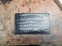 Плоский крокодиловый клатч из одежной кожи крокодила черного цвета ручная сборка, изделие выполнено мастером по индивидуальному заказу, после завершения изготовления Цельнокроеной сумки шопера из крокодиловой кожи одежной выделки в черном цвете, клиенту был передан обрез крокодиловой кожи, большие подбородочные части и длинные крокодиловые хвосты. Спустя некоторое время заказчик вернулся с идеей отшить из двух крокодиловых подбородков плоский клатч на молнии. Была разработана модель и клатч был отшит. На фото вы можете видеть и фото в процессе сборки и завершенный клатч. В данном случае была использована кожа крокодила одежной выделки, кожа была оплачена заказчиком при заказе сумки-шопера, так что приведенная стоимость изделия не включает стоимость крокодиловой кожи, а только стоимость материалов подклада, молнию и сборку.