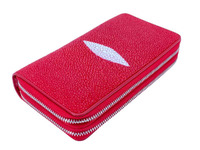 Ручной клатч-кошелек на двух молниях из натуральной кожи морского ската красного цвета. Для изготовления кошельков данной модели используется натуральная кожа морского ската, кожа высокого качества выделки и окраса, мягкая, эластичная и приятная на ощупь. В качестве основного украшения, данного клатча на лицевой стороне расположен вертикальный ромбообразный белый глазок. Таким белым глазком, при окрашивании кожи ската выделяют центральную крупнозернистую спинную часть шкурки морского ската. Клатч кошелек прямоугольной формы, состоит из двух независимых отделений на молнии, для удобства пользования клатчем выполнена выдвижная ручка, ручка выдвигается из торцевой части кошелька, ручка выполнена из натуральной кожи теленка. Клатч выполнен из двух независимых отделений, одно отделение состоит из: четырех одинаковых кармашков в которых можно хранить документы, мобильный телефон, банкноты и иные ценные предметы. Второе отделение разделено плоским карманом на молнии образую два кармашка для банкнот слева и справа от кармана на молнии. Карман на молнии может быть использован, как и как отделение для монет и как отделение для любых других ценных мелких предметов. Также в этом отделении устроено восемь отделений для различных карточек и два плоских кармана, устроенных за отделениями для карточек, плоские карманы выполнены на всю ширину клатча-кошелька. В качестве материала подклада используется натуральная кожа теленка и текстиль, материалы подобраны под цвет кож морского ската.