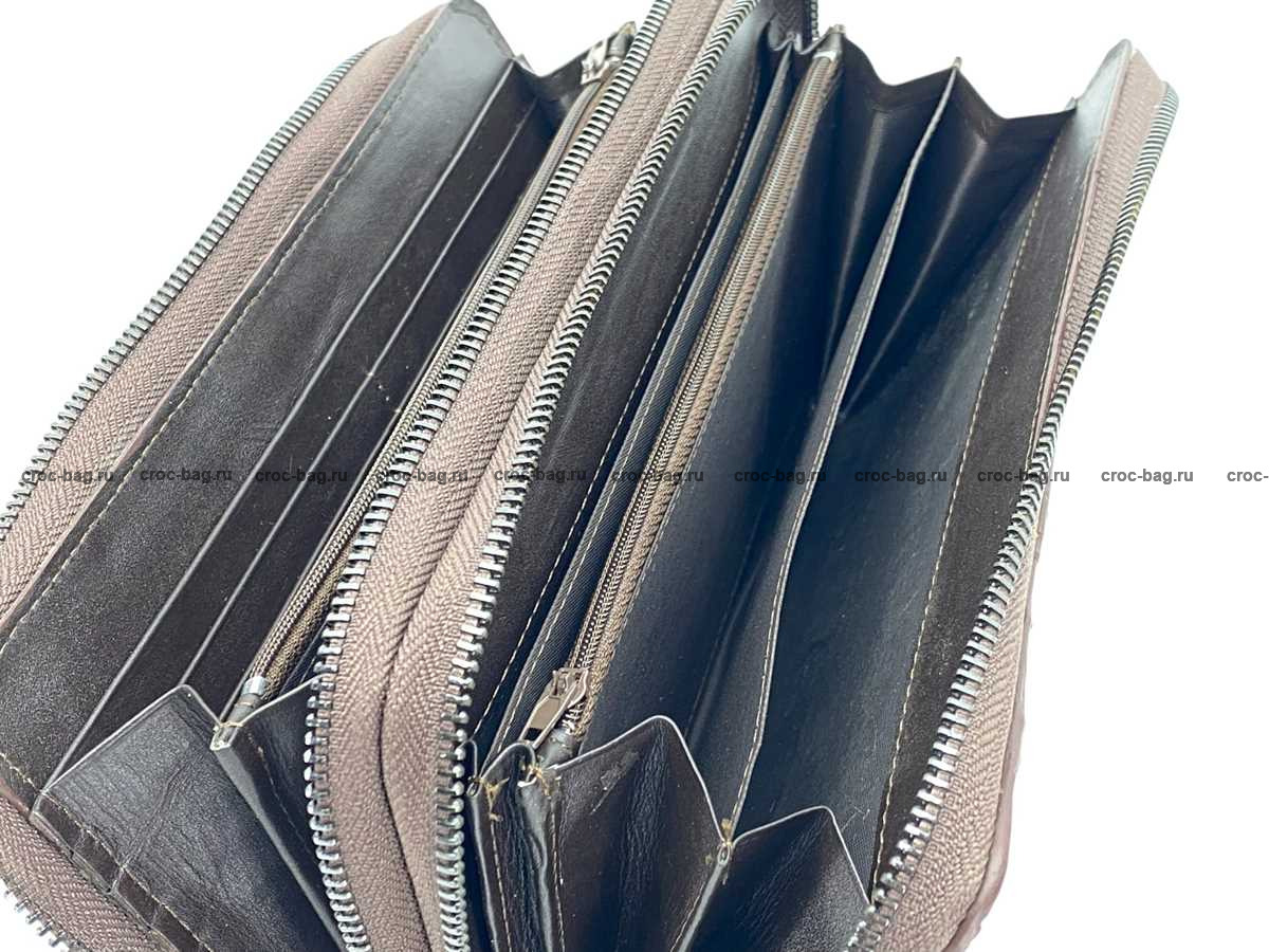 Большой, вместительный, функциональный клатч кошелек на двух молниях из фактурной крокодиловой кожи. Клатч оборудован съемной ручкой петелькой. Лицевая сторона крокодилового клатча украшена фактурной затылочной частью. Данный крокодиловый кошелек состоит из двух отделений, каждое из которых закрывается на отдельную крупную металлическую молнию темного цвета. Одно отделение состоит из двенадцати отделений для карточек, по шесть с каждой из сторон, за отделениями для карточек устроено по одному широкому плоскому карману, в центральной части этого отделения выполнено отделение на молнии которое можно использовать в том числе как отделение для мелких ценных предметов. Второе отделение на молнии содержит в себе плоский карман на молнии устроенный по центру и четыре отделения для документов и прочего. Текстиль использован в качестве материала подклада. Данные крокодиловые кошельки отшиты в качестве образца, в ближайшее время в производство будет отправлена партия клатчей-кошельков из кожи крокодила в различных цветах.