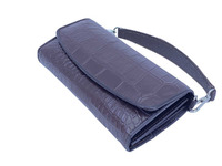 Женский клатч, меленькая женская сумочка из кожи крокодила темно-коричневого цвета. Для пошива женских клатчей данной модели использована натуральная крокодиловая кожа. Лицевой клапан выполнен из брюшной части крокодиловой шкуры, эта кожа имеет неповторимую фактуру даже при относительной гладкости кожи. Лицевая часть клатча, ниже лицевого клапана и обратная сторона, также отшиты из гладких брюшных частей крокодиловой шкуры. В верху клатча устроена верхняя ручка, ручка съемная, выполнена на основании из натуральной кожи теленка, кожа теленка по цвету подобрана под цвет кожи крокодила, верхняя часть ручки отделена крокодиловой кожей. Расстояние от верха клатча до верхней ручки 9см. Ручка крепится к клатчу на металлических карабинах, к D образным кольцам, расположенным на внутренней части лицевого клапана. Боковые вставки отшиты из кожи телёнка. Внутри клатч состоит двух одинаковых отделений, и одному отделению на молнии. На лицевой части устроено два небольших плоских кармашка предположительно под карточки. Отделение на молнии состоит из двух одинаковых отделений для банкнот. В комплекте с клатчем данной модели поставляется плечевой ремешок, толщина ремешка 1,5см, максимальная длина 120см, плечевой ремень с возможностью регулировки по длине, ремень изготовлен из кожи теленка коричневого цвета. В качестве материала подклада использован текстиль и кожа теленка в коричневом цвете. Женские клатчи данной модели являются довольно популярной моделью и изготавливаются как из различных сортов экзотической кожи таких как морского скат, питон, ящерица, так и из натуральной крокодиловой кожи с различной фактурой.