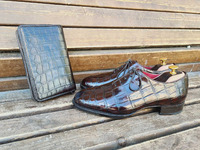 Пара оксфорды отшита мастером из натуральной кожи сиамского крокодила, РАНТОВОЙ метод КРЕПЛЕНИЯ (HAND WELTED), цвет коричневый, пара отшита по индивидуальному заказу. Кошелек из натуральной крокодиловой кожи на молнии, кошелек увеличенной вместимости, с убирающейся боковой ручкой-петелькой, цвет темно-коричневый. Окрашивание – легкое патинирование и финишное покрытие выполнено мастером в ручную. Если у Вас появились вопросы и или Вы хотите заказать индивидуальный пошив обуви, напишите нам, и мастер свяжется с Вами напрямую, общение с мастером без посредников, для обсуждения всех ваших вопросов, а также подскажет все о сроках и шагах при индивидуальном пошиве обуви, снятие мерки, изготовление примерочного макета и т.д. Мастер обладает многолетним опытом и владеет различными техниками пошива обуви любой сложности и любых моделей. Также вы можете заказать пошив кожгалантереи сумки, портфели, ремни, кошельки из различных сортов кожи кожа крокодила, кожа морского ската, кожи питона и т.д.