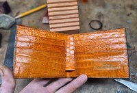 Мужской классический, двухскладный, кошелек, выполнен из натуральной крокодиловой кожи, снаружи кошелек окрашен в серо-синий цвет, внутри кошелек выполнен из крокодиловой кожи коньячного цвета, полностью ручная, , сборка, окрашивание и ручная прошивка и обработка края.