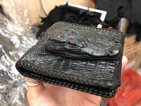 Данный кошелек был отшит нами как тестовый образец для заказчика. Кошелек из натуральной кожи крокодила головой крокодила в оплетке, цвет черный. Данный кошелек украшает натуральная крокодиловая голова, голова украшена глазками красного цвета. Глазки заметно оживляют и улучшают внешний вид изделия. В качестве дополнительного украшения по внешнему контуру кошелька выполнена оплетка. Оплетка выполнятся вручную, специальным тонким кожаным шнурком. Внутри кошелек состоит из шести отделений для карточек, одного поворотного откидного вверх отделения с двум прозрачными окошками и парой отделений для банкнот.