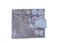 Складной кошелек из фактурной кожи крокодила с монетницей и внешним хлястиком цвет гималаи. Кошелек изготовлен из натуральной кожи сиамского крокодила, на лицевой части кошелька расположена спинная фактурная часть крокодиловой шкуры, переходящая в брюшную часть на обратной стороне кошелька. Внутри кошелек выполнен из натуральной кожи теленка подобранной под цвет кожи крокодила и текстиля. Внутри кошелек состоит из двух отделений для банкнот, шести слотов для карточек на первом развороте кошелька, отделением с прозрачным окошком и отделением для монет на втором развороте кошелька. Для удобства пользования во избежание произвольного открытия кошелек оборудован внешним хлястиком, хлястик выполнен из крокодиловой кожи. Данный крокодиловый кошелек являет собой классическую модель складного кошелька прямоугольной формы. Кошельками из кожи крокодила данной модели могут пользоваться как мужчины, так и женщины.