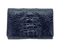 Женский кошелек тройного сложения из натуральной кожи крокодила с мелкой хвостовой фактурой шкуры молоденьких крокодильчиков, цвет черный. Удобная и популярная женская модель крокодилового кошелька. Для пошива кошельков данной модели фабрика использует натуральную кожу сиамского крокодила с различными природными фактурами и рисунками крокодиловой кожи. Крокодиловые кошельки данной модели приглянуться тем из вас, кто предпочитает складные кошельки с очень удобным функционалом. Данная модель кошельков внутри состоит из: отделения для банкнот, отделения для монет, девяти слотов для карточек одно из которых выполнено с прозрачным окошком и пяти плоских кармашков с доступом из центральной части кошелька, эти кармашки расположены и под отделения для карточек и под отделением для монет. Мягкая, натуральная кожа теленка, подобранная по цвету под цвет кожи крокодила и текстиль применяются в данных крокодиловых кошельках в качестве материалов подклада. Данные женские кошельки модели являются очень популярной моделью и отшиваются как из крокодиловой кожи, так и из кожи морского ската и кожи питона.