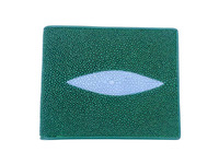 Классический складной кошелек из натуральной кожи морского ската цвет темно-зеленый. Натуральная кожа морского ската применяется фабрикой при пошиве кошельков данной модели. Основным украшением данного кошелька является горизонтальный белый глазок, такие белые глазки появляются при окрашивании кожи морского ската. При окрашивании шкурок морского ската классическим путем, белым цветом выделяют центральную спинную часть шкурки ската. Складной прямоугольный кошелек из кожи ската, классическая модель кошельков во всех его проявлениях, по форме и по содержанию. Внутри кошелек состоит из откидывающегося вверх окошка с двумя слотами для карточек с прозрачными окошками, по одному с каждой стороны. Шести отделений слотов для различных карточек, по три с каждой стороны кошелька и четырьмя плоскими кармашками с доступом из центральной части, по два кармашка с каждой стороны кошелька под слотами для карточек. Так же кошелек состоит из двух отделений для банкнот. Кошельками из кожи морского ската данной модели могут пользоваться как женщины, так и мужчины, тут все дело обстоит в ваших цветовых предпочтениях. Натуральная кожа теленка, подобранная по цвету под цвет кожи морского ската применяется в качестве материала подклада, также в качестве материала подклада используется ткань.
