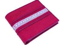 Складной кошелек из натуральной кожи морского ската малинового цвета с белой полосой. Для изготовления кошельков данной модели используется натуральная кожа морского ската с белой полосой «row stone» это специальный сорт кожи морского ската у которой полоска из крупных камней проходит по центральной части спины. Кожа высокого качества выделки и окраса. Лицевая и обратная стороны данных кошельков украшены белой каменной полоской, былым цветом эту каменную полоску окрашивают в процессе выделки и окрашивания шкурок морского ската, чтобы выделить крупные натуральные камешки на спинке морского ската. Кошелек двухскладный, внутри устроен классическим методом парой отделений с прозрачным окошком, парой отделений для купюр, шестью слотами для карточек и четырьмя плоскими кармашками. Натуральная кожа теленка, подобранная под цвет кожи морского ската используется в данных кошельках в качестве материала подклада, также в качестве материала подклада используется текстиль. Кошельки из кожи морского ската данной модели могут привлечь внимание как мужчин, так и женщин и в случае с данными кошельками при выборе изделия мужчины скорей всего отдадут предпочтение классическому черному цвету, а выбор женщин скорей всего остановится на ярких цветах, таких как красный, малиновый и фиолетовый. В случае, когда и если фабрика отошьет данную модель кошельков из кожи ската с белой каменной полоской в других цветах, ото мы постараемся представить кошельки из кожи ската в новых цветах на сайте.