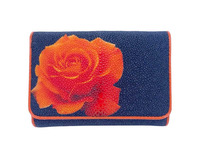 Одна из популярных моделей женских кошельков из натуральной кожи морского ската. Кошелек трехскладный из кожи морского ската черного цвета с узором в виде красной розы. Данная модель женских кошельков придется по вкусу тем из вас, кто отдает предпочтение среднеразмерным кошелькам высоким функционалом с повешенной вместимостью. На лицевой стороне кошелька устроен откидывающийся вверх лицевой клапан. Лицевой клапан фиксируется к кошельку на металлическую магнитную кнопку. Обратная часть кошелька изготовлена с применением кожи морского ската. На обратной стороне кошелка находится плоский карман, карман выполнен на всю ширину и высоту кошелька из ската. Внутри кошелек состоит из восьми слотов для разных карточек выполненных на левом отвороте кошелька, одного плоского кармашка, устроенного под слотами для карточек, в центральной части кошелька устроено отделение для монет, под отделением для монет выполнено два плоских кармана, на правом отвороте кошелька устроено отделение с прозрачным окошком, также кошелек имеет два отделения для банкнот, доступ к которым расположен в верхней части кошелька. Натуральная мягкая кожа теленка и текстиль использованы в качестве материалов подклада в данной модели кошельков. Как упоминалось ранее, данная модель кошельков является весьма популярной и востребованной у женщин и отшивается к натуральной коже морского ската различных цветах и с различными принтами, так и в коже питона и крокодиловой коже.