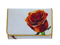 Одна из популярных моделей женских кошельков из натуральной кожи морского ската. Кошелек трехскладный из кожи морского ската белого цвета с узором в виде розы. Данная модель женских кошельков придется по вкусу тем из вас, кто отдает предпочтение среднеразмерным кошелькам высоким функционалом с повешенной вместимостью. На лицевой стороне кошелька устроен откидывающийся вверх лицевой клапан. Лицевой клапан фиксируется к кошельку на металлическую магнитную кнопку. Обратная часть кошелька изготовлена с применением кожи морского ската. На обратной стороне кошелка находится плоский карман, карман выполнен на всю ширину и высоту кошелька из ската. Внутри кошелек состоит из восьми слотов для разных карточек выполненных на левом отвороте кошелька, одного плоского кармашка, устроенного под слотами для карточек, в центральной части кошелька устроено отделение для монет, под отделением для монет выполнено два плоских кармана, на правом отвороте кошелька устроено отделение с прозрачным окошком, также кошелек имеет два отделения для банкнот, доступ к которым расположен в верхней части кошелька. Натуральная мягкая кожа теленка и текстиль использованы в качестве материалов подклада в данной модели кошельков. Как упоминалось ранее, данная модель кошельков является весьма популярной и востребованной у женщин и отшивается к натуральной коже морского ската различных цветах и с различными принтами, так и в коже питона и крокодиловой коже.