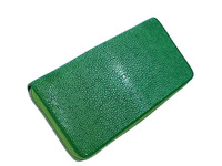 Кошелек из натуральной кожи морского ската на молнии зеленого цвета. Довольно редкая модель кошельков из полированной кожи морского ската. Натуральная, полированная, мягкая и очень приятная на ощупь кожа морского ската использована при пошиве кошельков данной модели. При прикосновении к данным кошелькам из полированной кожи морского ската всякий раз вы будете ощущать приятную гладкую, как мягкое стекло, прохладную поверхность кошелька. Кошелек из кожи ската правильной прямоугольной формы. Кошелек отшит из одного целого куска кожи морского ската, лицевая и обратная поверхности кошелька выполнены из полированной кожи ската. Кошелек оснащен П-образной металлической молнией. Внутреннее наполнение данного кошелька из полированной кожи пиона больше похоже на наполнение портмоне, чем на классический кошелек на молнии, Данные кошельки из кожи ската придутся по вкусу тем из вас кто предпочитает кошельки на молнии с высоким функционалом таким как, большое количество отделений для карточек, отделения для банкнот и отделение на молнии. Внутри кошелек состоит из: Двух отделений для банкнот, которые разделены плоским карманом на молнии. Это плоский карман на молнии удобно расположен и может использоваться и как монетница и как отделение для хранения иных мелких, но ценных предметов. Одного плоского кармана и двух отделений для карточек устроенных в одном из отделений для банкнот. Четырнадцати слотов для различный карточек и двух плоских карманов, устроенных на левой стороне кошелька под отделениями для карточек, доступ в эти плоские карманы из центральной части кошелька. Натуральная кожа теленка, подобранная по цвету под цвет кожи полированной кожи морского ската и текстиль применены в качестве материала подклада данных кошельков.