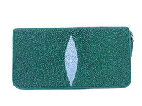 Кошелек на молнии из натуральной кожи морского ската, цвет темно-зеленый. Для изготовления кошельков данной модели применена натуральная высокого качества выделки и окраса, кожа морского ската, кожа ската с крупным зерном, очень приятная на ощупь и эластичная. Кошелек из кожи морского ската закрывается на металлическую молнию, молния П-образной формы, что позволяет более широко и удобно отрыть данный кошелек из ската. Внутри кошелька устроены отделения для банкнот, других предметов первой необходимости и мобильного телефона правда телефон должен быть не очень большой и не очень толстый иначе могут возникнуть сложности с застегиванием молнии, также внутри кошелька по центру устроен плоский карман на молнии, данный карман может быть использован и как отделение для монет и как отделение для иных мелких ценных предметов. Дополнительно внутри кошелька выполнены два плоских кармана на всю ширину кошелька, по одному с каждой стороны кошелька из ската и восемь слотов для различных каточек, по четыре на каждой стороне кошелька из кожи морского ската. Кошельки данной модели могут быть как мужскими, так и женскими тут все дело в ваших цветовых предпочтениях. Материалы подклада кошелька из кожи ската этой модели комбинированы: применена натуральная кожа теленка, подобранная под цвет кожи морского ската и текстиль. Кошельки из кожи морского ската данной модели являются классической моделью, очень популярны и отшиваются как в различных однотонных цветах, так и с цветными принтами и разнообразными узорами.
