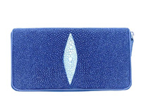 Кошелек на молнии из натуральной кожи морского ската, цвет темно-синий. Для изготовления кошельков данной модели применена натуральная высокого качества выделки и окраса, кожа морского ската, кожа ската с крупным зерном, очень приятная на ощупь и эластичная. Кошелек из кожи морского ската закрывается на металлическую молнию, молния П-образной формы, что позволяет более широко и удобно отрыть данный кошелек из ската. Внутри кошелька устроены отделения для банкнот, других предметов первой необходимости и мобильного телефона правда телефон должен быть не очень большой и не очень толстый иначе могут возникнуть сложности с застегиванием молнии, также внутри кошелька по центру устроен плоский карман на молнии, данный карман может быть использован и как отделение для монет и как отделение для иных мелких ценных предметов. Дополнительно внутри кошелька выполнены два плоских кармана на всю ширину кошелька, по одному с каждой стороны кошелька из ската и восемь слотов для различных каточек, по четыре на каждой стороне кошелька из кожи морского ската. Кошельки данной модели могут быть как мужскими, так и женскими тут все дело в ваших цветовых предпочтениях. Материалы подклада кошелька из кожи ската этой модели комбинированы: применена натуральная кожа теленка, подобранная под цвет кожи морского ската и текстиль. Кошельки из кожи морского ската данной модели являются классической моделью, очень популярны и отшиваются как в различных однотонных цветах, так и с цветными принтами и разнообразными узорами.