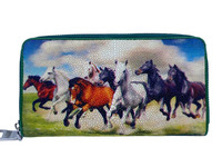 Классическая модель кошелька на одной молнии выполненная из кожи морского ската с разоцветным принтом в виде табуна лошадей. Для пошива кошельков данной использована натуральная кожа морского ската, кожа высокого качества выделки и окраса, приятная на ощупь и эластичная. Для изготовления данной модели кошельков из кожи ската используется один, целый кусок кожи морского ската, использование одного цельного куска кожи морского ската повышает привлекательность и стоимость данного кошелька. В верхней части кошелька из кожи морского ската вшита металлическая П-образная молния. На обеих сторонах кошелька выполнен одинаковый принт. Внутри кошелек состоит из пары отделений для банкнот, одного плоского кармана на молнии, восьми слотов для карточек, по четыре слота на каждой из сторон кошелька из кожи ската и двух плоских удобных кармана, по одному карману на каждой стороне кошелька эти карманы расположены над отделениями для карточек. Мягкая натуральная кожа теленка и текстиль используются внутри данного кошелька из кожи морского ската в качестве материалов подклада. Кошельки из кожи ската данной модели являются классическими и изготавливаются в различных цветовых вариантах, а также с различными цветными принтами.