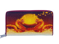 Классическая модель кошелька на одной молнии выполненная из кожи морского ската с разоцветным принтом в виде голов мифических драконов. Для пошива кошельков данной использована натуральная кожа морского ската, кожа высокого качества выделки и окраса, приятная на ощупь и эластичная. Для изготовления данной модели кошельков из кожи ската используется один, целый кусок кожи морского ската, использование одного цельного куска кожи морского ската повышает привлекательность и стоимость данного кошелька. В верхней части кошелька из кожи морского ската вшита металлическая П-образная молния. На обеих сторонах кошелька выполнен одинаковый принт. Внутри кошелек состоит из пары отделений для банкнот, одного плоского кармана на молнии, восьми слотов для карточек, по четыре слота на каждой из сторон кошелька из кожи ската и двух плоских удобных кармана, по одному карману на каждой стороне кошелька эти карманы расположены над отделениями для карточек. Мягкая натуральная кожа теленка и текстиль используются внутри данного кошелька из кожи морского ската в качестве материалов подклада. Кошельки из кожи ската данной модели являются классическими и изготавливаются в различных цветовых вариантах, а также с различными цветными принтами.