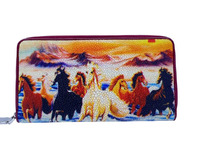 Классическая модель кошелька на одной молнии выполненная из кожи морского ската с разоцветным принтом в виде бегущего табуна лошадей на фоне скалистых гор. Для пошива кошельков данной использована натуральная кожа морского ската, кожа высокого качества выделки и окраса, приятная на ощупь и эластичная. Для изготовления данной модели кошельков из кожи ската используется один, целый кусок кожи морского ската, использование одного цельного куска кожи морского ската повышает привлекательность и стоимость данного кошелька. В верхней части кошелька из кожи морского ската вшита металлическая П-образная молния. На обеих сторонах кошелька выполнен одинаковый принт. Внутри кошелек состоит из пары отделений для банкнот, одного плоского кармана на молнии, восьми слотов для карточек, по четыре слота на каждой из сторон кошелька из кожи ската и двух плоских удобных кармана, по одному карману на каждой стороне кошелька эти карманы расположены над отделениями для карточек. Мягкая натуральная кожа теленка и текстиль используются внутри данного кошелька из кожи морского ската в качестве материалов подклада. Кошельки из кожи ската данной модели являются классическими и изготавливаются в различных цветовых вариантах, а также с различными цветными принтами.