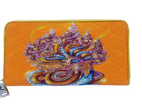 Классическая модель кошелька на одной молнии выполненная из кожи морского ската с разоцветным принтом в виде многоголового мифического существа. Для пошива кошельков данной использована натуральная кожа морского ската, кожа высокого качества выделки и окраса, приятная на ощупь и эластичная. Для изготовления данной модели кошельков из кожи ската используется один, целый кусок кожи морского ската, использование одного цельного куска кожи морского ската повышает привлекательность и стоимость данного кошелька. В верхней части кошелька из кожи морского ската вшита металлическая П-образная молния. На обеих сторонах кошелька выполнен одинаковый принт. Внутри кошелек состоит из пары отделений для банкнот, одного плоского кармана на молнии, восьми слотов для карточек, по четыре слота на каждой из сторон кошелька из кожи ската и двух плоских удобных кармана, по одному карману на каждой стороне кошелька эти карманы расположены над отделениями для карточек. Мягкая натуральная кожа теленка и текстиль используются внутри данного кошелька из кожи морского ската в качестве материалов подклада. Кошельки из кожи ската данной модели являются классическими и изготавливаются в различных цветовых вариантах, а также с различными цветными принтами.