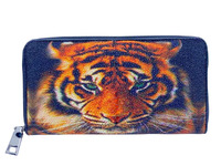 Классическая модель кошелька на одной молнии выполненная из кожи морского ската с разоцветным принтом в виде морды тигра. Для пошива кошельков данной использована натуральная кожа морского ската, кожа высокого качества выделки и окраса, приятная на ощупь и эластичная. Для изготовления данной модели кошельков из кожи ската используется один, целый кусок кожи морского ската, использование одного цельного куска кожи морского ската повышает привлекательность и стоимость данного кошелька. В верхней части кошелька из кожи морского ската вшита металлическая П-образная молния. На обеих сторонах кошелька выполнен одинаковый принт. Внутри кошелек состоит из пары отделений для банкнот, одного плоского кармана на молнии, восьми слотов для карточек, по четыре слота на каждой из сторон кошелька из кожи ската и двух плоских удобных кармана, по одному карману на каждой стороне кошелька эти карманы расположены над отделениями для карточек. Мягкая натуральная кожа теленка и текстиль используются внутри данного кошелька из кожи морского ската в качестве материалов подклада. Кошельки из кожи ската данной модели являются классическими и изготавливаются в различных цветовых вариантах, а также с различными цветными принтами.