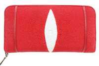 Популярная модель среднеразмерного кошелька на молнии из натуральной кожи морского ската. Данная модель кошелька из кожи ската на молнии популярна как среди женщин, так и среди мужчин, тут все зависит от ваших вкусовых предпочтений в цвете кошелька. Кошельки данной модели придутся по вкусу тем из вас кто отдает предпочтение, функциональным кошелькам на молнии среднего размера. Для пошива кошельков данной модели используется натуральная кожа морского ската, кожа ската первого сорта, кожа ската высочайшего качества выделки, кожа крупнозернистая, эластичная и упругая, мягка и приятная на ощупь. В основном, на лицевой поверхности кошелька мы можем видеть белый глазок, таким образом, белым глазком, при окрашивании выделяется центральная часть шкуры морского ската, центральная спинка кожи ската. Но белый глазок на кошельках из кожи ската встречается не всегда, иногда бывают разноцветные принты и при таком окрашивании кожи морского ската белый глазок могут не окрашивать. Также бывает, что кошельки из кожи морского ската отшивают с применением полированной кожи морского ската, в этом случае, на лицевой поверхности кошелька мы увидим крупные белёсые зерна центральной части шкуры морского ската. Кошельки из кожи ската на молнии данной модели довольно функциональны, кошельки оборудованы П-образной металлической молнией, ширина раскрытия открытого кошелька более девяноста градусов, что позволяет с удобством и комфортом обнаружить и достать из кошелька, любой предмет, в том числе карточки размещенные на внутренних боковых поверхностях кошелька. Данная модель кошелька из натуральной кожи морского ската на молнии состоит из восьми отделений для карточек, двух широких карманов, устроенных на всю ширину изделия и расположенных за отделениями для карточек на внутренних сторонах кошелька. Пары отделений для банкнот расположенных по сторонам от центрального отделения-кармашка на молнии, данное отделение на молнии можно использовать и как монетницу и как отделение на молнии для хранения чего-то ценного. Данный кошелёк из кожи морского ската не предназначен хранения и ношения мобильных телефонов, скорей кошелек предназначен исключительно для карточек, банкнот и всяких заметок, фото, иконок, оберегов, всякой мелочи что люди обычно таскают с собой в кошельке. Данная модель кошелька на молнии довольно популярная и отшивается в коже морского ската с различными узорами и в различных цветовых решениях. Также такая модель кошелька на молнии отшивается и в других сортах экзотической кожи, коже сиамского крокодила, коже питона, коже варана.