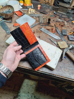 Данный кошелек был отшит мастером по индивидуальному заказу, полностью ручная сборка, прошивка, обработка края. Кошелек складной из натуральной кожи крокодила, и страуса. Кошелек оборудован отделением для монет, слотами для карточек и отделением для банкнот. Внутренняя часть кошелька выполнена из крокодиловой кожи в черном и оранжевом цветах, применение крокодиловой кожи внутри изделия делает его уникальным, а сочетание цветов черного и оранжевого делает его более привлекательным и не таким монотонным, как если бы внутри кошелек был полностью выполнен в черном цвете.