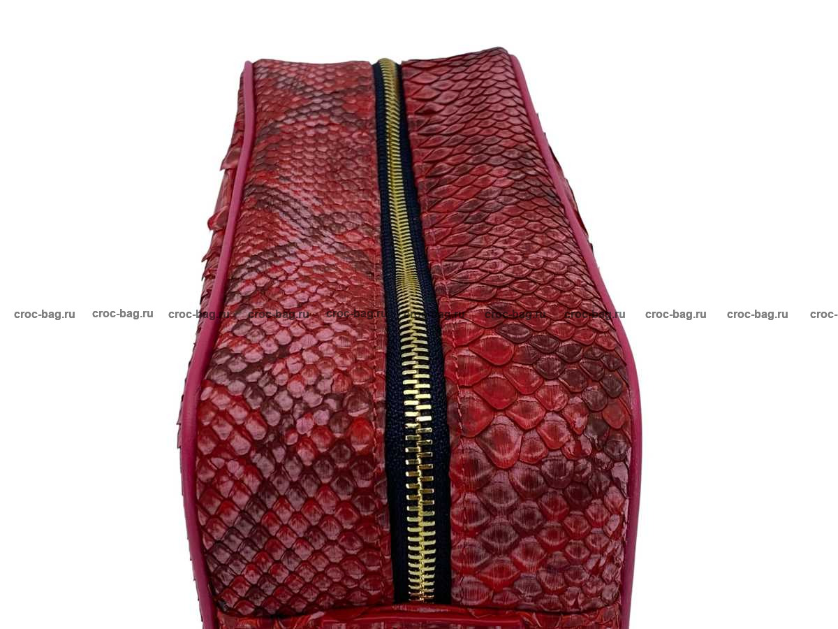 Сумка для косметики из натуральной питоновой кожи, косметичка прямоугольной формы, верхней части косметички вшита металлическая молния золотого цвета, молния заведена на боковые поверхности косметички, что позволяет получить более широкий и удобный доступ внутрь. На боковых поверхностях косметички выполнены ушки за которые удобно держать косметичку в момент ее открытия или закрытия. Косметичка мягкая и принимает любую удобную для вас форму. Косметичка внутри выполнена в одном объеме, для большего удобства внутри выполнено два широких кармана на всю ширину косметички. Мягкий текстиль применен в качестве материала подклада. Данной питоновой косметичкой могут пользоваться как мужчины, так и женщины, все зависит от ваших цветовых предпочтений. Эта питоновая косметичка была отшита в серии косметичек из натуральной кожи питона в различных цветах.