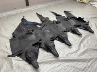 Декоративная кожа молодого сиамского крокодила, спинная часть, с натуральной крокодиловой головой и крокодиловыми лапами цвет черный. В наличии крокодиловые шкуры шириной 30-35см в ассортименте, длина шкур 115-125см.