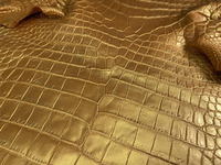 Натуральная кожа сиамского крокодила, брюшная часть цвет золотой, ширина шкуры 45см. Крокодиловое брюхо высокого качества выделки и окраса, толщина кожи 1,2мм этот материал идеально подходит для индивидуального пошива обуви, сумок, портфелей, кошельков, ремней и прочей кожгалантереи. Мы не занимаемся искусственным увеличением ширины шкуры путем ее растягивания, поэтому если вы ищете крокодиловую кожу, которой согласно вашему проекту вам надо обтянуть, например, обувную колодку, смело обращайтесь к нам. Также хочется отметить что фотографии крокодиловой кожи представлены справочно и по факту могут отличаться от шкур из наличия как по форме, таки по оттенку, поэтому перед покупкой свяжитесь с нами и попросите предоставить вам живые фото и видео необходимых вам шкур.