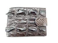 Мужской кошелек из крокодиловой кожи, это довольно редкая модель, увеличенного размера. Кошелек изготовлен из натуральной кожи сиамского крокодила, хвостовая часть крокодиловой шкуры, кожа крокодила высокого качества выделки и окраса, кожа мягкая и эластичная и эта фактурная часть крокодиловой кожи очень приятная на ощупь. Кошелек данной модели придётся по вкусу тем из вас кто отдает предпочтение вместительным и функциональным кошелькам, с отделением для монет и внешним хлястиком. Внешние стороны бумажника выполнены с применением красивой и неповторимой хвостовой части крокодиловой шкуры. Внешний хлястик на кнопке выполнен из крокодиловой кожи. Внутри кошелек изготовлен с повышенной функциональностью: На первом раскрытии кошелька устроено восемь отделений для карточек и одно отделение с доступом из центральной части кошелька. Второе раскрытие устроено с двумя большими отделениями с прозрачными окошками, некоторые из наших клиентов купившие кошельки данной модели утверждали, что они смогли поместить техпаспорт в эти отделения. Третье раскрытие одно отделение с прозрачным окошком, одно отделение для монет или других мелких, но ценных предметов, отделение для карточки расположенное за отделением для монет и один боковой карман с доступом из центральной части бумажника. Два классических отделения для банкнот, в одном из которых устроено одно отделение на молнии на всю ширину кошелька. Мягкая кожа теленка и текстиль использованы для внутреннего наполнения.