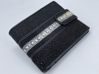 Кошелек из кожи морского ската черного цвета, украшением которого является с лицевой и обратной стороны вставка из кожи морского ската с белой полосой, из крупных бусин центральной части шкуры ската.Бумажник закрывается хлястиком на кнопке.Внутри кошелька расположены два отделения для банкнот,в левой части три отделения для пластиковых карт,кармашек с прозрачным окошком и справа монетница на кнопке.Для внутреннего наполнения кошелька использованы мягкая кожа теленка и текстиль.