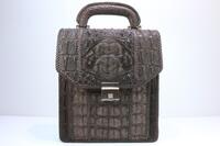 Сумка мужская, вертикальная, прямоугольной формы, сумка-планшет из натуральной факторной крокодиловой кожи. Для изготовления сумок данной модели используются очень фактурные спинные гребни сиамского крокодила. Кожа крокодила высокого качества выделки и окраса. Сумка классической прямоугольной формы, на лицевой поверхности расположен откидывающийся вверх лицевой клапан, основным украшением лицевого клапана является фактурный крокодиловый затылок, затылок неповторимый по своей форме и природному рисунку. Затылочная часть крупная и симметричная. В верхней части клапана устроена удобная ручка, ручка изготовлена из крокодиловой кожи. В нижней части клапан фиксируется на металлический кодовой замочек. Лицевая часть сумки, откидывающийся вверх лицевой клапан, верхняя ручка, задняя часть сумки, все это изготовлено из фактурной крокодиловой спины. Для придания сумке эластичности боковые вставки выполнены из натуральной кожи теленка окрашенного под цвет кожи крокодила. Дополнительным украшением сумки является то, что все соединения крокодиловой кожи, а также все внешние края, включая верхнюю ручку и плечевой ремень, все это оплетено специальным плетением с применением шнура из кожи теленка, подобранного под цвет крокодиловой кожи. В верхней части боковых поверхностей размещены специальные D-образные кольца для крепления съемного плечевого ремня. Съемный плечевой ремень, выполненный из кожи теленка под цвет изделия и оплетенный по внешнему краю идет в комплекте с сумкой. Плечевой ремень с возможностью регулировки по длине. На лицевой поверхности сумки, устроен удобный клапан с боковыми вставками из кожи телека, для большей подвижности лицевого кармана. Плоским карманом на молнии, внутренний объем сумки разделен на две части, в одной части устроен широкий накладной карман с учетом возможности использовать его для современного смартфона. В другой части сумки устроены приспособления для пишущих принадлежностей и накладные карманы для карточек. Внутреннее убранство сумки комбинированное, кожа теленка под цвет кожи крокодила и текстиль. Сумка данной модели является довольно популярной у мужчин и отшивается нами регулярно.
