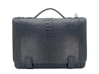 Классическая деловая мужская сумка-папка из кожи питона, также эту модель можно назвать портфелем из питоновой кожи. Для изготовления сумки данной модели использована натуральная кожа питона, кожа мягкая и приятная на ощупь, высокого качества выделки и окраса. На лицевой поверхности портфеля устроен откидывающийся вверх клапан который фиксируется на металлическо-магнитные кнопки в нижней части сумки. Вверху сумки устроена удобная ручка, выполненная в коже питона и кольца для крепления плечевого ремня. Лицевая и обратная сторона сумки-папки устроены в коже питона. Боковые поверхности сумки выполнены в коже теленка черного цвета. Под лицевым клапаном устроен широкий накладной карман для телефона или калькулятора, пара отделений для пишущих приспособлений и несколько отделений для карточек. Плоский карман на молнии делит внутренний объем портфеля на два отделения, одно из отделений полностью пустое, во втором отделении устроен накладной карман на молнии. Внутреннее убранство сумки-папки выполнено из мягкой кожи теленка черного цвета. Съемный и регулируемый по длине плечевой ремень идет в комплекте с сумкой. Ремень выполнен из кожи теленка с отделкой кожей питона, также для удобства пользования на плечевом ремне имеется площадка под плечо, площадка сделана из кожи теленка с отделкой кожей питона.