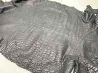 Натуральная крокодиловая кожа одежной выделки, цвет черный матовый, ширина шкуры 50см, толщина 0,8мм. Данная крокодиловая кожа отлично подойдет для индивидуального пошива верхней одежды, например, куртки из кожи крокодила. Кожа очень мягкая и эластичная, высокое качество выделки и окраса, на представленных фото одежная кожа крокодила на имеет финишного покрытия, посему может выглядеть несколько белесо и невзрачно, но это только до момента нанесения финишного покрытия, после чего одежная кожа крокодила приобретет необходимую глубину и насыщенность черного цвета. В этой партии выделки было 10 крокодиловых шкур, которые стали кожей крокодила одежной выделки. Вот размеры шкур из этой, одной партии выделки: 38см, 45см, 46см, 47см, 47см, 47см, 48см, 49см, 50см и 50см. Все эти 10 крокодиловых шкур одежной выделки пока доступны и в наличии. Данная одежная кожа крокодила не является кожей крокодила первого сорта. На каких-то крокодиловых шкурах есть небольшие дефекты, какие-то без дефектов, надо смотреть как выкройка ложиться на кожу крокодила, что можно обойти при раскрое, в что нет. Также доступна под заказ кожа крокодила одежной выделки, брюшная часть сорт А, размер +50см, напишите нам, и мы постараемся выделать и окрасить одежную кожу крокодила для вашего проекта.