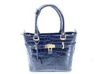 Современная, модная женская сумка из натуральной крокодиловой кожи, для пошива сумок данной модели используется натуральная кожа сиамского крокодила. Крокодиловая кожа высокого качества выделки и окраса. Женская сумка классической трапециевидной формы, с небольшим расширением к верхней части сумки. Лицевая часть сумки, обратная сторона, верхние ручки сумки, боковые поверхности, дно сумки все это выполнено из кожи крокодила. В качестве основного украшения сумки, на лицевой ее поверхности устроен декоративный ремешок из кожи крокодила с замочком, замочек отделан крокодиловой кожей. К одной из ручек сумки прикреплен тонкий шнурок из кожи крокодила, на шнурке размещен ключик для замочка. На обратной стороне сумки устроен удобный карман с доступом через металлическую молнию. Ручки сумки выполнены в крокодиловой кожи и имеют высоту достаточную для ношения этой сумки как в руках, так и на предплечье. Крепление ручек сумки выполнено с применением металлических прямоугольных колец. В верхней части сумки устроена металлическая молния преграждающая доступ в основной объем сумки. Молния слегка притоплена. Плоский карман на молнии делит внутреннее пространство сумки на два объема. Для удобства пользования крокодиловой сумкой на внутренних поверхностях сумки устроены удобные карманы, в одном объеме сумки сдвоенный накладной карман один плоски, второй объемный, в другом объеме вшивной карман на молнии. На боковых поверхностях сумки, вшиты D-образные кольца для крепления съемного плечевого ремня. Съемный и регулируемый по длине плечевой ремень выполнен на основании из натуральной кожи теленка, цвет кожи теленка подобран под цвет кожи крокодила. Внешняя поверхность плечевого ремня украшена декоративной полоской из крокодиловой кожи под цвет изделия. В качестве материала подклада сумки использована натуральная кожа теленка, цвет кожи теленка подобран под цвет наружной крокодиловой кожи.