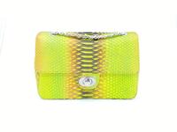 Женская сумка из питоновой кожи цвет токсично желтый, ярко-желтый с черной медной полосой.