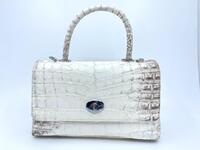 Сумка женская из натуральной кожи сиамского крокодила, брюшная часть, размер сумки 9,5 дюймов, сумка среднего размера, но довольно вместительная. Эта сумка изготовлена по мотивам сумки известного бренда Chanel, однако никаких названий Chanel на сумке нет. Для изготовления сумок данной модели используется натуральная брюшная часть шкур сиамского крокодила, используемая кожа приобретена на крокодиловых фермах, а значит ни одна крокодиловая особь в дикой природе не пострадала. Кожа высокого качества выделки и окраса, очень приятная на ощупь, мягкая и эластичная. На лицевой поверхности сумки мы видим откидывающийся вверх лицевой клапан. В центральной части лицевой поверхности устроен металлический поворотный замочек, который фиксирует нижнюю часть откидывающегося вверх клапана. В верхней части клапана расположена удобная ручка, ручка выполнена из крокодиловой кожи, слева и справа от мест крепления ручки вшиты D-образные кольца для крепления плечевого ремешка. Съемный плечевой ремешок в виде цепочки, звенья которой оплетены кожей теленка под цвет изделия в комплекте. Все наружные части сумки, такие как лицевой клапан, обратная часть, верхняя ручка, лицевая часть сумки боковые поверхности и дно сумки, все выполнено в коже крокодила. На обратной стороне сумки устроен удобный накладной карман. На дне сумки расположены четыре металлические ножки. Плоский карман делит основной объем сумки на два отделения. Внутри сумки, для удобства выполнен вшивной боковой карман на молнии. Внутренняя отделка сумки выполнена в мягкой коже теленка подобранной под цвет сумки. При изготовлении сумки использована фурнитура золотого цвета.