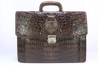 Классический, большой мужской портфель формата А4 из крокодиловой кожи, кожа крокодила кайман, кожа высокого качества выделки, кожа мягкая, эластичная и очень приятная на ощупь. Портфель данной модели является классическим крупноформатным, повышенной вместимости, удобным и практичным. На лицевой поверхности устроен прямой, откидывающийся вверх лицевой клапан. Основным украшением этого крокодилового портфеля является красивая, крупная и симметричная затылочная часть кожи крокодила расположенная на лицевом клапане. Затылочная часть имеет неповторимую природную фактуру и узор. В нижней части клапан фиксируется на кодовый замок. Лицевая часть портфеля, расположенная ниже лицевого клапана, образует удобный плоский карман-гармошку для предметов первой необходимости, ключи, ключ-карта и так далее. Обратная часть портфеля выполнена с применением крокодиловой кожи со спинной фактурой. На обратной стороне портфеля в верхней его части устроен удобный плоский карман. В верхней части портфеля из крокодиловой кожи расположена объемная ручка, ручка выполнена из кожи крокодила под цвет изделия. Боковые поверхности портфеля, для большего удобства и эластичности выполнены из кожи теленка под цвет изделия. На боковых поверхностях также располагаются кольца для крепления съемного плечевого ремня. Этот крокодиловый порфтфель достаточно широкий и объемный и имеет повышенную вместимость. Плоским карманом на молнии портфель разделен на два отделения. В дном из отделений расположен удобный накладной карман на молнии, в другом отделении выполнены приспособления для пишущих инструментов и отделения для карточек. Съемный, регулируемый по длине плечевой ремень, выполненный из кожи теленка, с отделкой из крокодиловой кожи, в комплекте. В качестве материала подклада данного портфеля из крокодиловой кожи была применена кожа теленка под цвет изделия и текстиль.