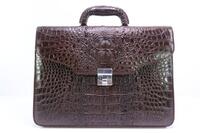 Классический мужской портфель формата А4 из фактурной крокодиловой кожи, кожи сиамского крокодила. Для пошива портфелей данной модели используется кожа крокодилов выращенных на специальных крокодиловых фермах, что означает, что ни одно животное в дикой среде не пострадало. Кожа высокого качества выделки, приятная на ощупь мягкая и эластичная. Портфели данной модели является классическим среднеформатным, но довольно вместительным, удобным и практичным. На лицевой поверхности расположен откидывающийся вверх лицевой клапан, клапан украшен красивой, симметричной затылочной частью крокодиловой шкуры. В нижней части клапан фиксируется на кодовый замок. Лицевая часть, расположенная ниже лицевого клапана, выполнена из кожи крокодила с неповторимой по своей природной фактуре спинной частью крокодиловой кожи. Обратная часть портфеля выполнена с применением крокодиловой кожи со спинной фактурой. На обратной стороне портфеля в верхней его части устроен доступ в плоский карман. В верхней части портфеля из крокодиловой кожи расположена удобная ручка, ручка выполнена из кожи крокодила под цвет изделия. Боковые поверхности портфеля, для большей эластичности выполнены из кожи теленка под цвет изделия. На боковых поверхностях также располагаются D- образные кольца для крепления съемного плечевого ремня. Давайте рассмотрим из чего этот портфель состоит внутри: Лицевая часть, та что располагается ниже лицевого клапана и выполнена из кожи крокодила с фактурной спинной частью, откидывается вниз. Внутри этого отделения устроен удобный плоский карман, выполненный на всю ширину изделия и плоские отделения для карточек, одно из которых с прозрачным окошком. Плоским отделением на молнии основной объем портфеля разделен на два отделения. В дном из отделений устроен удобный накладной карман на молнии, в другом отделении выполнены два приспособления для пишущих инструментов и отделения для карточек. Съемный, регулируемый по длине плечевой ремень, выполненный из кожи теленка, с отделкой из крокодиловой кожи, в комплекте. В качестве материала подклада данного портфеля из крокодиловой кожи была применена кожа теленка под цвет изделия и текстиль.