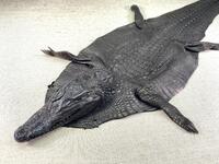 Натуральная шкура сиамского крокодила, крокодиловая шкура с головой и лапами цвет черный, ширина шкуры 27см. Эта кожа молодых крокодиловых особей, шкурки скорей декоративные, для размещения на стене или каминной полке, экзотическим образом дополнит практически любой интерьер, отличный и оригинальный подарок для близкого человека. Натуральная крокодиловая шкура с настоящей крокодиловой головой, голова с челюстями и зубами. Шкура с передними и задними лапами, лапы с пальцами и крокодиловыми когтями. Некоторые из мастеров приобретают эти шкуры и делают из этой кожи накладки для телефонов, ремешки для часов бумажники и прочую мелкую кожгалантерею. Молодая крокодиловая кожа имеет полную текстуру крокодиловой кожи, но еще не имеет ярко выраженной спинной текстуры, что придает коже большую податливость способствует пошиву.