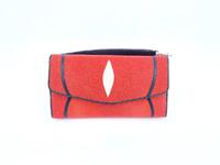 Популярная модель женской сумки клатча отшитая в натуральной коже морского ската. Сумка прямоугольной формы, с откидывающимся вверх лицевым клапаном. Лицевой клапан изготовлен из натуральной кожи морского ската, в качестве украшения на лицевом клапане расположен белый глазок, это центральная часть шкуры морского ската. В нижней части сумки лицевой клапан фиксируется на металлическую магнитную кнопку. Обратная часть сумки клатча выполнена из кожи морского ската. На обратной части сумки расположен удобный плоский карман с доступом в верхней части, карман устроен на всю ширину клатча из кожи ската. Под лицевым клапаном находится основной объем сумки состоящий из нескольких отделений. Отделения для предметов первой необходимости такие как мобильный телефон, ключи, документы и отделения на молнии предназначенного для банкнот или иных любых мелких ценных предметов. Внутри сумка выполнена из кожи теленка и ткани. Сумка из кожи морского ската оборудована верхней съемной ручкой. Верхняя поверхность съемной ручки выполнена из кожи морского ската. Также клатч оборудован съемный регулируемым по длине плечевым ремешком. Плечевой ремешок для сумки из кожи ската выполнен из кожи теленка. Данные клатчи являются довольно популярной моделью, можно сказать классической и изготавливаются из кожи морского скат в различных цветах, так и в крокодиловой коже различных фактур кожи и цветов крокодиловой кожи.