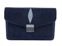 Мужская барсетка из натуральной кожи морского ската цвет черный. Для пошива барсеток данной модели была использована высококачественная, мягкая, эластичная и очень приятная на ощупь кожа морского ската. На лицевой поверхности мы видим откидывающийся вверх лицевой клапан, в нижней части клапан фиксируется на металлический поворотный кодовый замочек. Лицевой клапан украшен вертикальным белым ромбовидным глазком. Такой белый глазок появляется при классическом окрашивании кожи морского ската, таким образом выделяют центральную спинную часть шкурки морского ската. Поверхность барсетки под лицевым клапаном также выполнена из кожи морского ската. Обратная часть барсетки выполнена с применением крупнозернистой кожи ската. На обратной стороне барсетки устроен довольно удобный плоский карман, с доступов в верхней части барсетки. Карман выполнен на всю ширину и на высоту барсетки. При взгляде на главное фото барсетки может сложится ощущение в том, что барсетка отшита не ровно и ее левый верхний край выше правого края. Это небольшое искривление вызывается только лишь наличием выдвижной ручки петельки, устроенной под лицевым клапаном внутри. Выдвижная ручка петелька выполнена из натуральной кожи теленка и при необходимости выдвигается или задвигается обратно. Боковые вставки и дно барсетки выполнены из натуральной кожи теленка, и по своей форме напоминают гармошку именно применение гармошко-подобных вставок добавляют эластичности боковым поверхностям и позволяют при необходимости увеличить внутренний объем барсетки с 7-8см в спокойном состоянии, до 12-13 см при максимально наполненной барсетке. Внутри под лицевым клапаном барсетки устроено откидывающееся вниз и вперед отделение, отделение фиксируется на металлическую магнитную кнопку, устроенную в верхней части. Внутри этого отделения выполнено два широких плоских кармана, на противоположной стороне устроено шесть отделений для различных карточек. Плоски карман на молнии делит барсетку на два отделения. В одном из отделений устроен накладной карман на молнии. В барсетке из кожи морского ската данной модели не предусмотрено плечевого ремня. В качестве материала подклада барсетки из кожи ската используется натуральная кожа теленка черного цвета и текстиль.