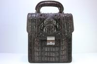 Сумка мужская, вертикальная, прямоугольной формы, сумка-планшет из натуральной факторной крокодиловой кожи. Для изготовления сумок данной модели используются очень фактурные спинные гребни сиамского крокодила. Кожа крокодила высокого качества выделки и окраса. Сумка классической прямоугольной формы, на лицевой поверхности расположен откидывающийся вверх лицевой клапан, основным украшением лицевого клапана является фактурный крокодиловый затылок, затылок неповторимый по своей форме и природному рисунку. Затылочная часть крупная и симметричная. В верхней части клапана устроена удобная ручка, ручка изготовлена из крокодиловой кожи. В нижней части клапан фиксируется на металлический кодовой замочек. Лицевая часть сумки, откидывающийся вверх лицевой клапан, верхняя ручка, задняя часть сумки, все это изготовлено из фактурной крокодиловой спины. Для придания сумке эластичности боковые вставки выполнены из натуральной кожи теленка окрашенного под цвет кожи крокодила. Дополнительным украшением сумки является то, что все соединения крокодиловой кожи, а также все внешние края, включая верхнюю ручку и плечевой ремень, все это оплетено специальным плетением с применением шнура из кожи теленка, подобранного под цвет крокодиловой кожи. В верхней части боковых поверхностей размещены специальные D-образные кольца для крепления съемного плечевого ремня. Съемный плечевой ремень, выполненный из кожи теленка под цвет изделия и оплетенный по внешнему краю идет в комплекте с сумкой. Плечевой ремень с возможностью регулировки по длине. На лицевой поверхности сумки, устроен удобный клапан с боковыми вставками из кожи телека, для большей подвижности лицевого кармана. Плоским карманом на молнии, внутренний объем сумки разделен на две части, в одной части устроен широкий накладной карман с учетом возможности использовать его для современного смартфона. В другой части сумки устроены приспособления для пишущих принадлежностей и накладные карманы для карточек. Внутреннее убранство сумки комбинированное, кожа теленка под цвет кожи крокодила и текстиль. Сумка данной модели является довольно популярной у мужчин и отшивается нами регулярно.