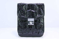 Компактная мужская плечевая сумка прямоугольной формы из крокодиловой кожи черного цвета. Ширина-18см, высота-22см, толщина-6-7см. Для пошива плечевых сумок данной модели используется натуральная кожа сиамского крокодила фактурная спинная часть. Крокодиловая кожа высокого качества выделки и окраса, фактурная спинная часть. На лицевой части сумки расположен откидывающийся вверх лицевой клапан, в нижней части клапан фиксируется металлический кодовый замок. Основным крашением сумки является крупная фактурная затылочная часть крокодиловой шкуры, размещенная на лицевом клапане. Лицевая поверхность сумки ниже лицевого клапана выполнена с применением крокодиловой кожи с фактурной спинной частью. Обратная часть сумки выполнена из кожи крокодила со спинной частью. Для придания сумке большей эластичности, боковые вставки сумки выполнены с применением мягкой кожи теленка. Внутри сумки, под лицевым клапаном устроено откидывающееся вперед отделение, это отделение фиксируется в верхней части на металлическую магнитную кнопку. Внутри этого откидывающегося вперед отделения устроено несколько удобных плоских карманов. Несъемный плечевой ремень, с возможностью регулировки длины прикреплен к сумке посредством кожаных колец, вшитых во внутренней части лицевого клапана. Плечевой ремень выполнен на основании из кожи теленка и для дополнительного украшения сумки имеет отделку крокодиловой кожей. Сумка внутри выполнена в одном объеме. В качестве материала подклада используется натуральная кожа телека и текстиль, цвет кожи телёнка подобран под цвет кожи крокодила.