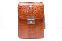 Компактная мужская плечевая сумка планшет из натуральной кожи крокодила цвет светло-коричневый. Ширина-15см, высота-23см, толщина-7-8см. Для пошива сумок данной модели используется натуральная кожа крокодила, спинная часть молодых крокодильчиков. На лицевой поверхности сумки устроен откидывающийся вверх лицевой клапан, в нижней части клапан фиксируется к сумке на металлический кодовый замок. В качестве украшения на лицевом клапане мы видим фактурный крокодиловый затылок. В верхней части сумки вшита небольшая ручка. Лицевая поверхность сумки ниже лицевого клапана выполнена с применением крокодиловой кожи с хвостовой фактурой. Обратная часть сумки выполнена с применением спинной фактуры крокодиловой шкуры. Для придания сумке большей эластичности боковые части сумки устроены из кожи теленка. В верхней части боковых поверхностей устроены металлические кольца для крепления съемного плечевого ремня. Съемный плечевой ремень, с возможностью регулировки по длине в комплекте с сумкой. Плечевой ремень изготовлен на основании из натуральной кожи теленка, в качестве дополнительного украшения лицевая поверхность плечевого ремня имеет отделку кожей крокодила. На обратной части сумки устроен специальный карман открывающийся в сторону, карман фиксируется на два наружных хлястика, расстегнув которые открывается отделение. Внутри этого отделения устроены плоские карманы, накладной кармана, пара карманов на молнии и отделение для пишущих принадлежностей. Внутри сумки под лицевым клапаном, плоской стенкой внутренний объем сумки делится на два независимых кармана. В качестве материала подклада используется текстиль (ткань) и натуральная кожа теленка, кожа теленка по цвету подобрана под цвет наружной кожи крокодила.